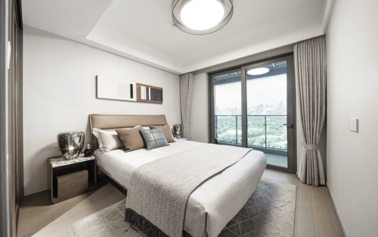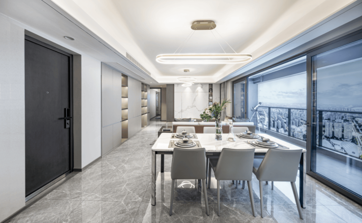 立面风格依然是融创经典的现代高级灰,杭曜之城&杭望云潮城还进一步优化了建筑立面,大面玻璃点缀香槟金线条,建筑体精致又鲜明,交付后无疑又是区域的吸睛焦点。