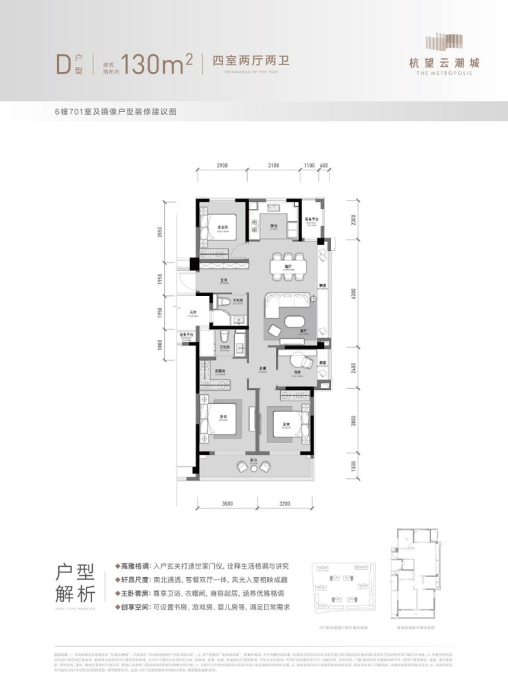 该户型为项目的四房起步户型,建面约130方,四房两厅两卫的格局。