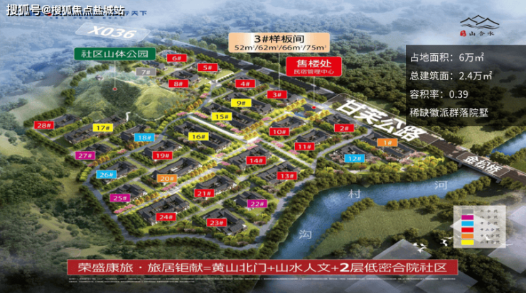 荣盛·山合水合院2.0规划有六、八、十、十二、十六、二十合院,仅28栋352套,超大楼间距8-18米,户型面积在52㎡--85㎡,是黄山地区仅有的群落院墅徽派院落。