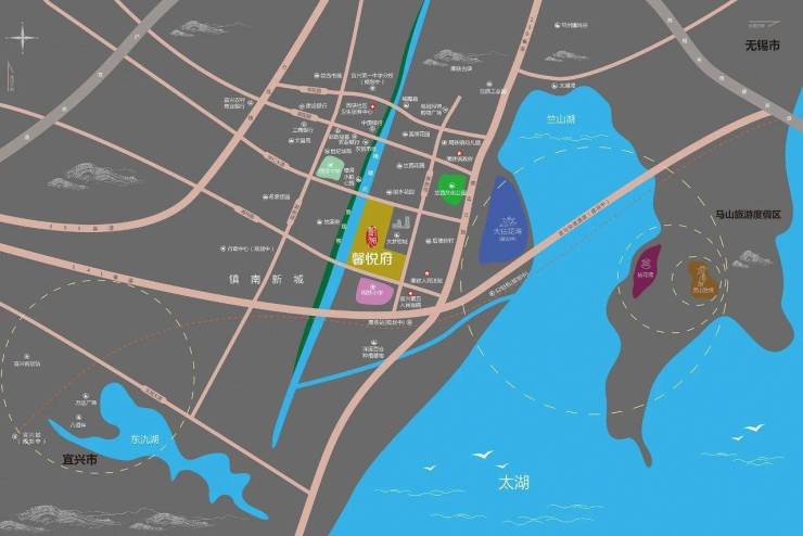 2.宜马快速通道的出入口也在附近,双向6车道设计穿越竺山湖到达马山镇与苏锡常南部高速无缝对接可走太湖隧道到达无锡太湖新城。