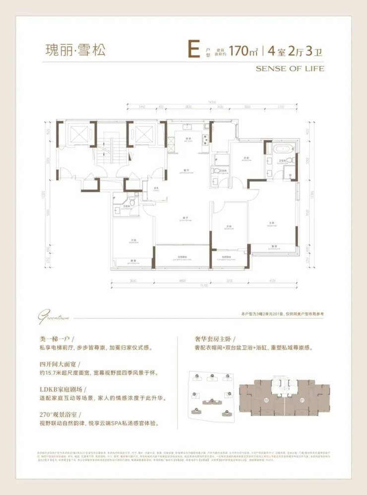 建面约170方户型实现“主卧小家化”,奢华套房式主卧,奢配衣帽间+双台盆卫浴+浴缸,同时配有大飘窗,采光和景观面不输大客厅。