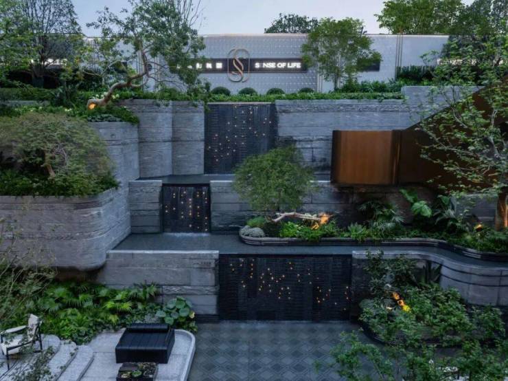 “层林叠院”解构弗兰克·劳埃德·赖特“流水别墅”精髓,三阶跌水倾泻而下。台地花园有序排布,红枫、斜飘紫薇等绿植营造四季景致。阶梯步道、休憩空间巧妙设置,景随人移,随自然渐入沉浸。