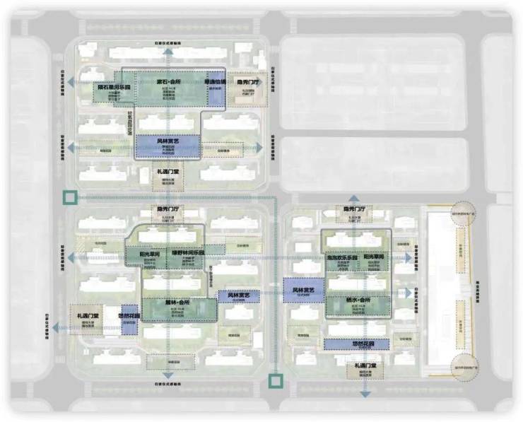 整体的社区营造上采用江南园林设计手法,提取“环秀山庄”“艺圃”、“网师园”的经典元素。通过“回”字型分布形成“一带、三心、五轴、多组团”的整体景观布局。