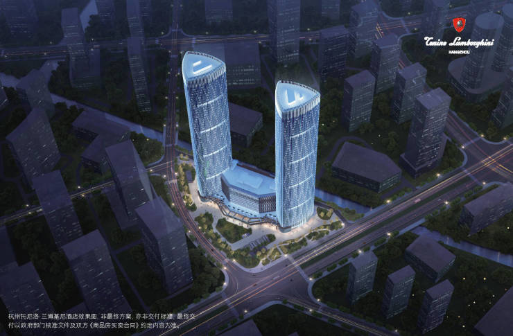 【建筑规划】:T1、T2为250米双塔楼(60层,T1写字楼、T2杭州托尼洛·兰博基尼行政公寓)、T3裙楼(12 层,杭州托尼洛·兰博基尼酒店)