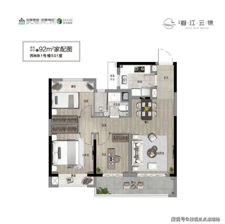 还有约92㎡3房户型,也是联通式阳台,实用性高。