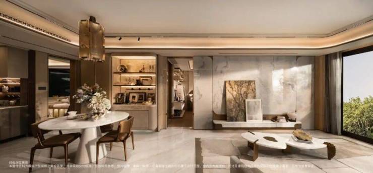 在材质与细节上,115㎡户型从入户开始就拉满顶豪质感,木饰面可随心切换高光白栓木/ 雅光球莎木双款木饰面,搭配铂金冰玉等三款岩板背景墙,让小户型也有不妥协的专属格调。