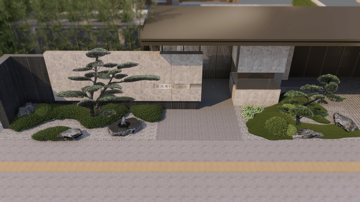 同时大门配有水钵,黑松,这样的搭配不仅视觉上效果更好,也能中和掉材料本身的冷感。