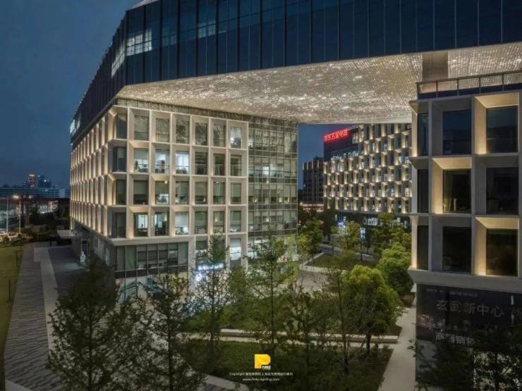 建筑的动线中轴之上有大体块的雨棚天花区域,设计时考虑了项目整体的视觉需求,在连贯的窗框灯效果之余,也大胆的将整个天花区域以穿孔铝板的形式进行灯光表达。考虑了项目整体的成本把控与效果层次,灯光将效果的重心主要表现建筑立面及过道天花之上,灿若星辰,婉若银河。建筑顶部玻璃幕墙区域则适当的留白,明暗上形成对比,层次上富有节奏。