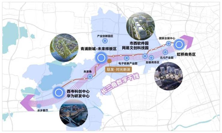 以上海青浦为起点的"长三角数字干线",沿G50高速构建万亿级数字产业生态,涵盖西岑科创中心、市西软件信息园、虹桥北斗产业园、张江科学城等。