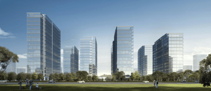 整个园区以围合式布局展开,七幢建筑借鉴中国古典园林的精髓,最大楼间距达到了63米,使得每栋楼都能享受到270°的开阔视野,仿佛是一座座隐匿于花园中的岛屿。为了与景观相呼应,园区立面采用“水晶天幕”设计,线条纤细,使建筑宛如天空中垂下的纯净湖面。