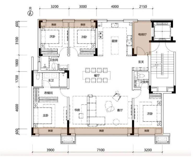 除了入户电梯厅的赠送,南北侧客厅与房间都设计了飘窗赠送,合计15.8-19.7㎡的高赠送超值空间。