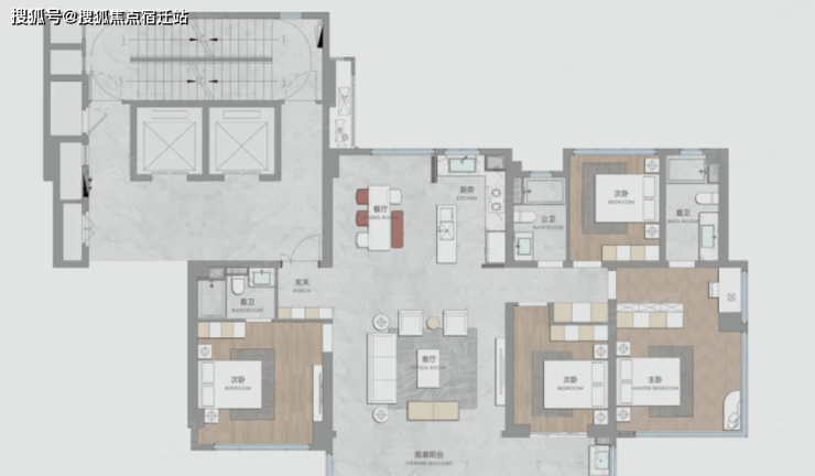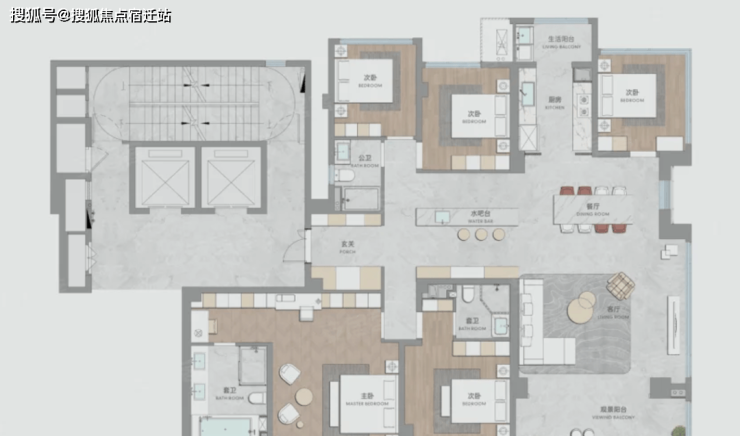 175平:四房两厅三卫,四开间朝南的大面宽布局,非常主流,其中右侧套卫是暗卫,这个户型的通病,餐厅+厨房做开放设计,如果隔断,空间感会降低不少,亮点还是主卧的L型大玻璃。