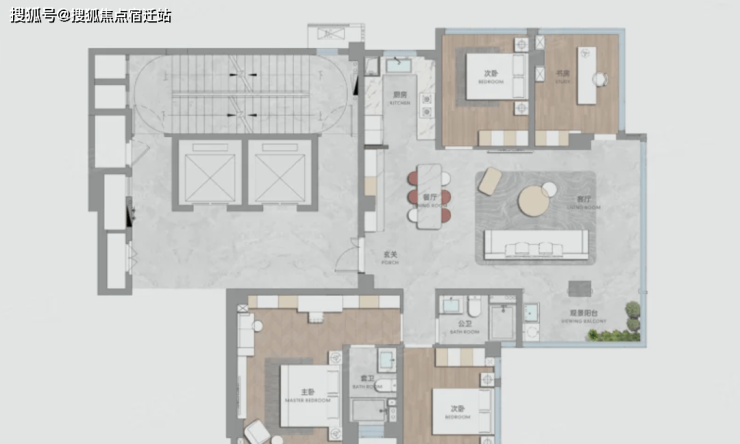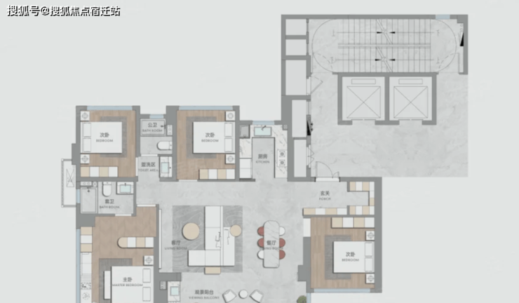 143平:四房两厅两卫,位于三栋楼的西端,占比一半的产品,非常主流的布局,大面宽横厅设计,亮点是主卧做了L型大玻璃。