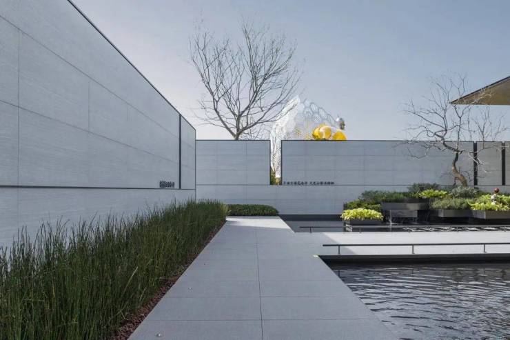 整个中庭背景立面简洁干净统一,水景墙设计语言延续统一建筑立面,同时也是售楼处入口观赏的最佳点位;