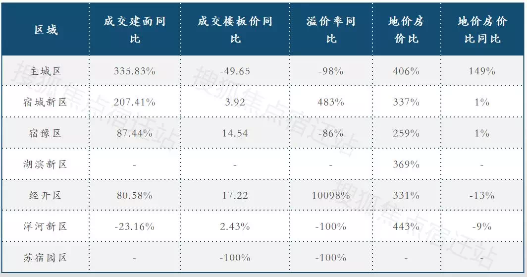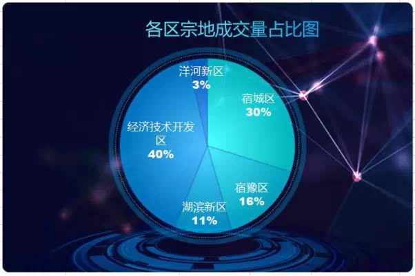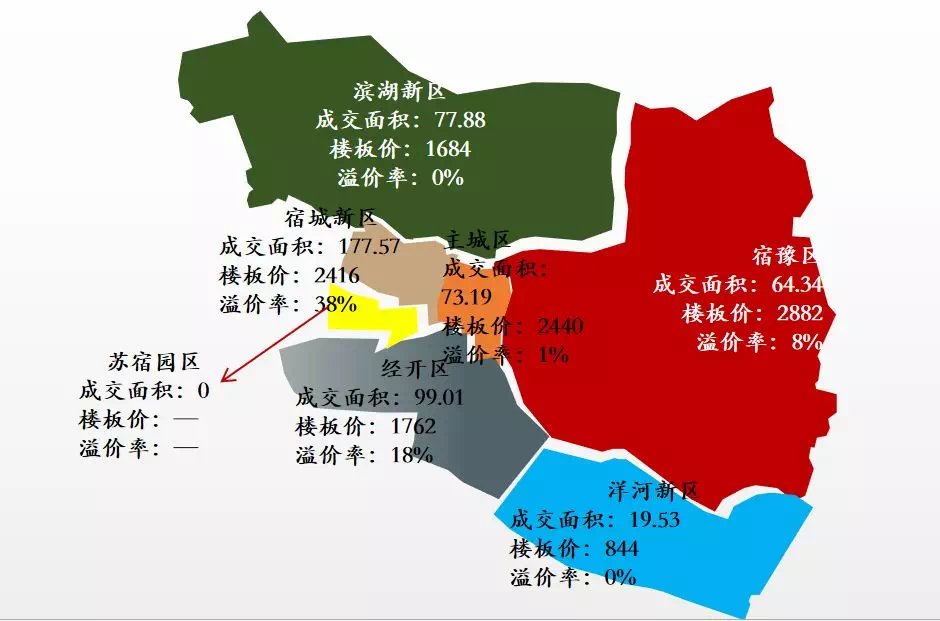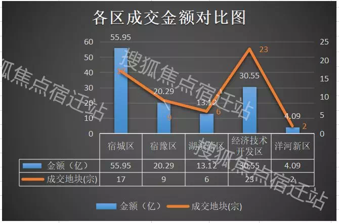 宿城区无论在商住用地还是工业用地,挂牌出让宗数最多;经开区随着高铁的建立和开通,在工业以及商住上紧随其后,在各区宗地成交量占比中,占比排名前列。可见这将是继宿城区之后又一个重点发展的区域。