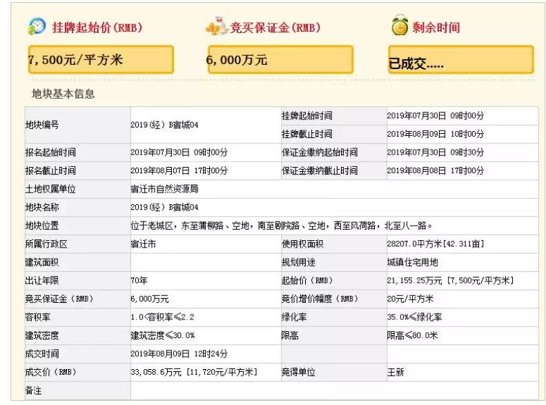2019年8月9日,王新以3.31亿元(成交均价11720元/㎡)拍得2019(经)B宿城04地块,成为该轮拍卖中名副其实的地王,共计665.6万/亩,溢价率56.3%。据悉该地将由地产龙头之一万科,建设新项目这将是2020年宿迁房产备受瞩目楼盘之一。