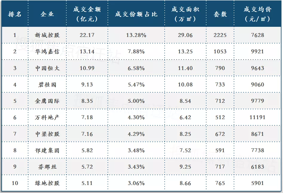 2019年宿迁商品住宅成交金额排名,新城控股成交22.17亿元领跑榜单,份额占比13.28%;华鸿嘉信和中国恒大分别以13.14亿元、10.99亿元分获二三名。