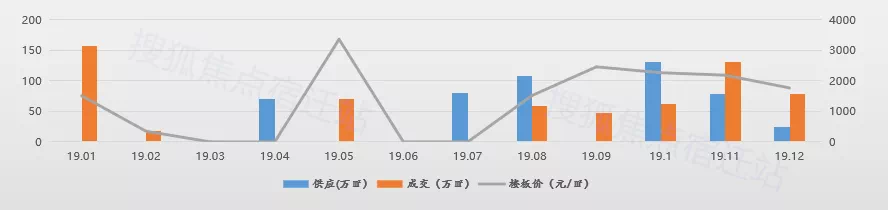 土地供应面积493.5万方,同比增长15.3%;成交面积623.3万方,同比增长145.9%;溢价率14.7%,同比下滑29.5%;成交土地楼板价2011元/平,同比增长9.0%。2019年土地供求量位居近五年高位,成交同比上涨146%左右,住宅用地备受热捧。土地成交涨幅显著,地价走高带动成交楼板价上涨,土地溢价率则下滑。