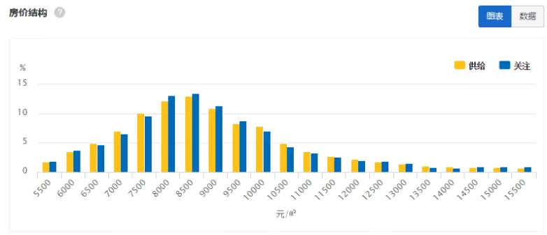 从供给和关注度来看,均价在7500元/㎡-9500元/㎡的楼盘关注度较高,其中均价在8000元/㎡-8500元/㎡的楼盘,大多数市民接受度较高,这就意味着普通市民可接受承受的房价在8000-8500元/㎡之间,超过这个价格将难以承受。