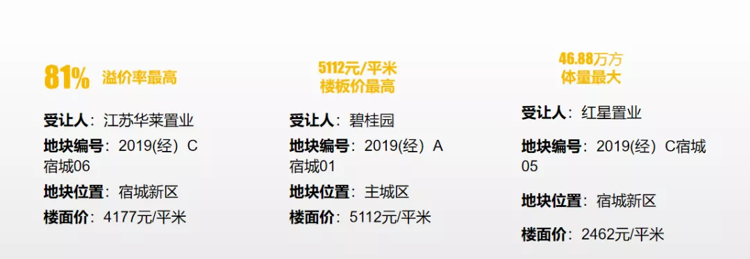 宿城区2019(经)A宿城01地块,该地块以852万元/亩的成交单128493.95万元的成交总价“夺冠”19年土地市场,由上海新碧房地产开发有限公司(碧桂园)拍得,鼎鼎有名的江山赋诞生于此,2019年12月开盘时以备案均价13126-22221元/㎡成为古黄河板块的年度地王。