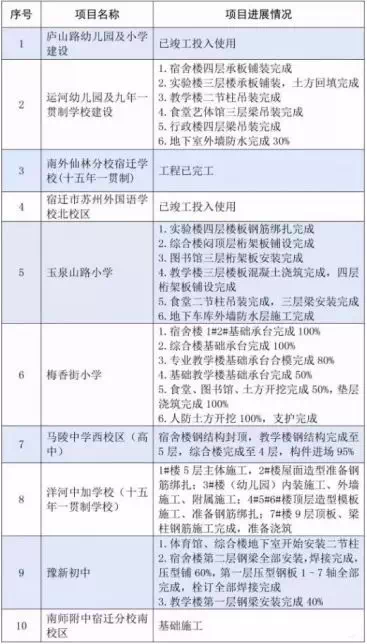 2019年宿迁市共投入建设20所学校,其中中小学13所,幼儿园6所,十五年一贯制学校1所,2020年8月可以全部投入使用,全面配合宿迁楼市所需,解决学区紧张“上学难”等问题。