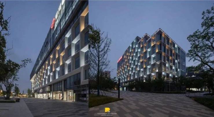 在建筑的表达上也经过了反复的琢磨与取舍,强调窗框的几何造型,弱化浅色铝板的结构表达,让立面的视觉观感更加的整体,双色温的光色表达也让建筑外立面更加通透,光影遮盖了建筑的棱角,凸显了他的构筑,让地块原本闭合的建筑布局平添几分轻松灵动的气韵。