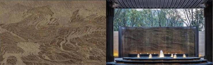 汾河承载了历代风华,晨钟暮鼓,更哺育着一代又一代的人。背景墙采用金丝镶嵌手法结合汾河主题表现出传统与当代的演变,是文化与当代审美的艺术展现。园区次入口水幕墙为不锈钢仿铜凸面金丝纹路板水幕墙:该水幕墙由4块直面不锈钢板、2块曲面不锈钢板组成。每块不锈钢板均采用不锈钢蚀刻工艺,金丝纹路部位凸出板面1.5mm。