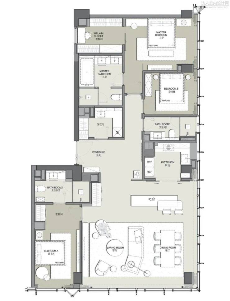 在华润杭州亚运村超高层公寓项目中,DIA主持了四个交付户型的室内设计,本文为大家重点展示其中F1户型精装样板间。