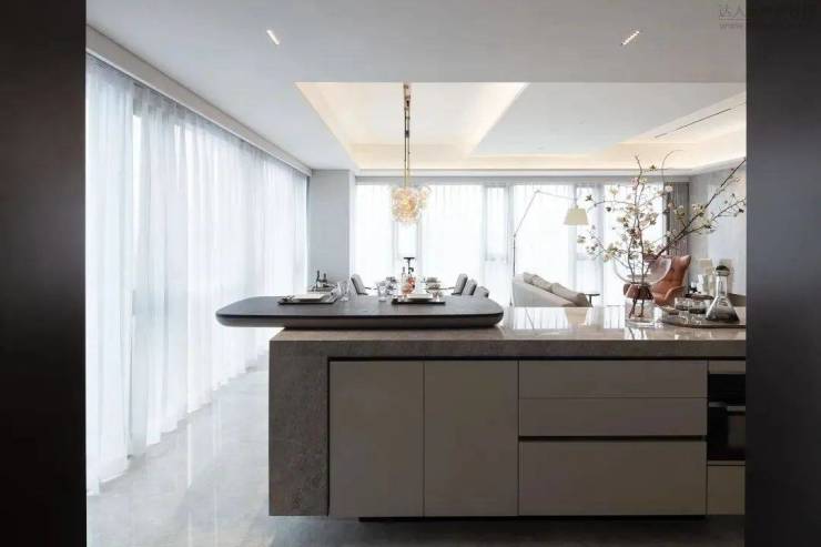 厨房、吧台和客餐厅构成家庭互动活动的沙龙区。近8米面宽的明亮区域,让家人们共聚一堂也绰绰有余~