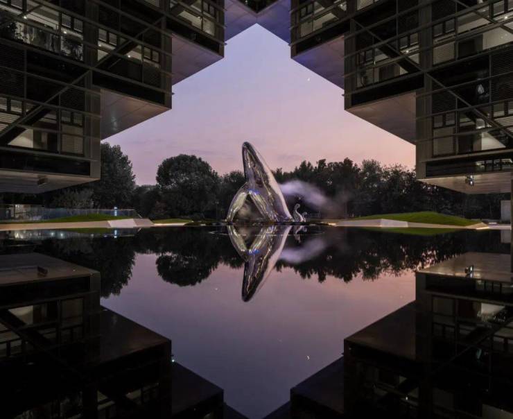 雕塑-鲸鱼出水的动态设计灵感来源于浩瀚的海洋与古老的神话故事庄周《逍遥游》。“北冥有鱼,其名为鲲”。“鲲”奋力跃起的姿态也象征年轻人生活、事业节节上升、富有朝气,寓意美好。设计始于对西溪深蓝建筑本体、景观与人的生活氛围解读,以海洋为主题,鲸鱼通过深蓝色的氛围灯配合着雾森,像遨游在西溪深蓝的海洋中,刚跃出水面的造型,象征着年轻人洋溢蓬勃的青春活力,在X龙门的映照下,带来震撼的视觉冲击效果的同时打造网红坐标,将平安幸福的美好寓意传递给每一位家人。