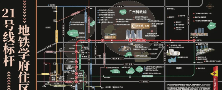 大华城——涵盖大华朱村中心城市地标(规划中)、地铁、教育、产业、商业、生态各项配套,名副其实的一生大城,未来容纳广州东约 30 万人口繁华居住地。
