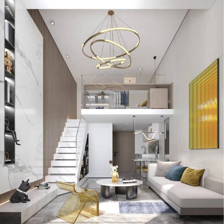 约4.5米挑高灵动格局,百变格局更随心建面约76㎡效果图示意,实际为毛坯交付,具体请以合同为准