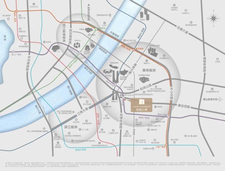 这里是资源环聚的世界之窗——大小“莲花碗”,T-ONEMO(在建)、奥体中心、奥体印象城、滨江银泰城、杭州SKP(在建)等地标座座壁立。这里也是通达四方的枢纽所在——揽奥云璟往西约200米即为风情大道,凭借三横两纵路网快速直达滨江区政府、万象城、来福士、市民中心等。