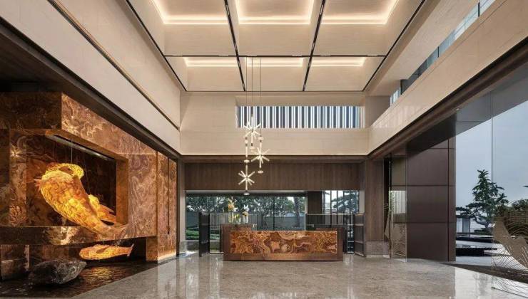 Water and soil nourish people. Wuxi's inclusive and gentle water culture is deeply imprinted in people's hearts. With suzhou Taihu stone as inspiration, refining, deformation, combination of a rich and very sculptural modeling body. The tension red texture jade is selected to create a strong sense of visual impact when entering the hall.