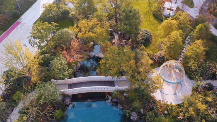 60%的超高绿化率,整个小区灵感来自于纽约中央公园,同时融入了江南园林淡雅内敛的风格精华,在顺应原本地貌的基础上,打造一心九轴的高品质景观。