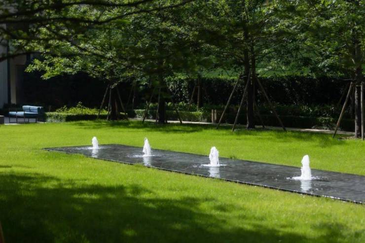 作为重要的入门空间,我们延续国际化都会风格,使之成为归家流线中的门面担当。三排冠幅五米、高约8米的榉树营造出林荫式归家感受,随着季节的变化榉树也将呈现出不同的色彩变化;归家路上的榉树林,充分考虑归家人群的驻足休闲需求,设置可落座,可闲聊的空间,也利用了林荫下的舒适氛围,为社群创造交流空间。