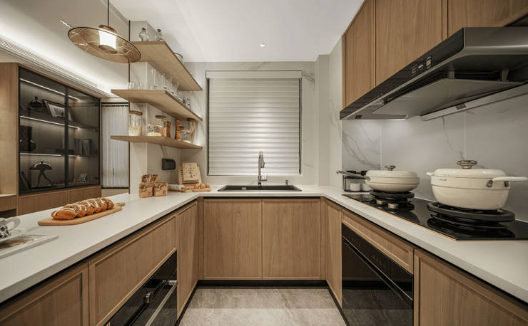 与此同时,U型厨房的设计也让动线更加合理,在万科城的设计理念里,我们倡导家庭成员共同完成美味的制作,在洗切炒的烹饪过程中,让美好加温。当然,细节的设计不止于此,在样板间内,有有限的厨房内,将每一寸空间都利用起来,岛台设计更加新颖,不仅可以变身mini西厨、收纳空间,同时也可以成为交流平台。