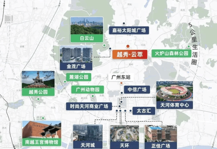 1 公里范围内有广垦壹号商业 mall、信达金茂等商业;5 公里范围内有东方宝泰、天河城、天环、太古汇等高端商业中心,满足居民的日常购物、娱乐和休闲需求。