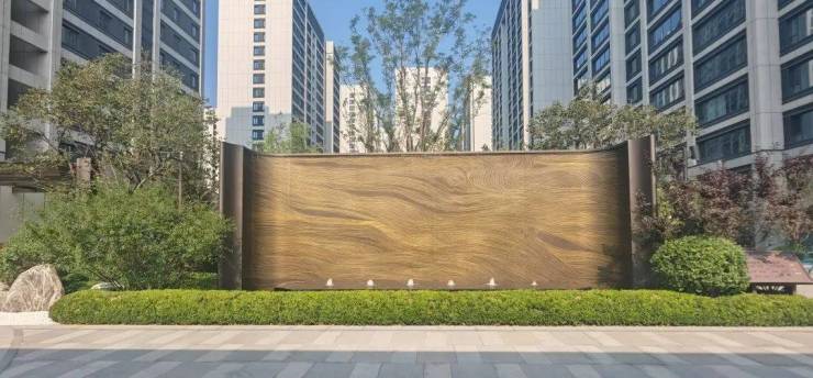 汾河承载了历代风华,晨钟暮鼓,更哺育着一代又一代的人。背景墙采用金丝镶嵌手法结合汾河主题表现出传统与当代的演变,是文化与当代审美的艺术展现。园区次入口水幕墙为不锈钢仿铜凸面金丝纹路板水幕墙:该水幕墙由4块直面不锈钢板、2块曲面不锈钢板组成。每块不锈钢板均采用不锈钢蚀刻工艺,金丝纹路部位凸出板面1.5mm。