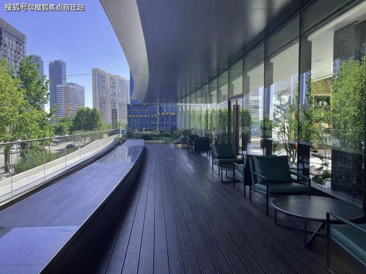 客厅之外,是视野极佳的花园露台,左右被屋顶花园的花境围绕,近15米弧形观景长椅,特选了蓝钻石材进行异型加工,坐在这里面对的是全景展开的城市风景,享受独属于此的天际线。屋顶花园中精心布置了25种花境植物,和谐的色调搭配创造出的花园露台,又多了分柔美优雅的氛围。