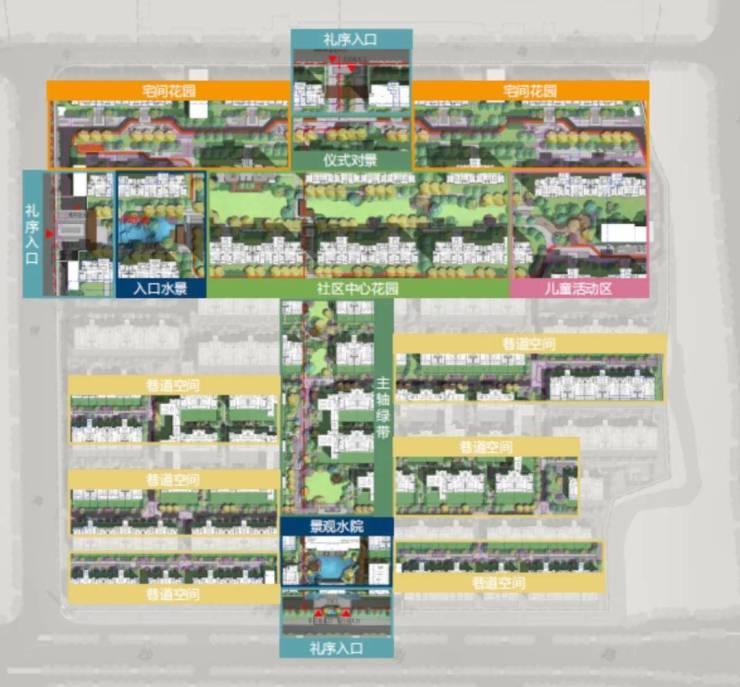 溪悦阁师法狮子林造园精粹,整体以纵横两大景观轴线为序列,营造先入园后归家的江南意趣。南北景观轴以南侧出入口为起始点,经景观水院、主轴绿带、社区 中心花园,直通北侧出入口;东西景观轴西起西门出入口,经入口水景,景观社区中心花园,终于儿童活动区。两轴交织,布局精巧典雅,深具中式古典意趣。