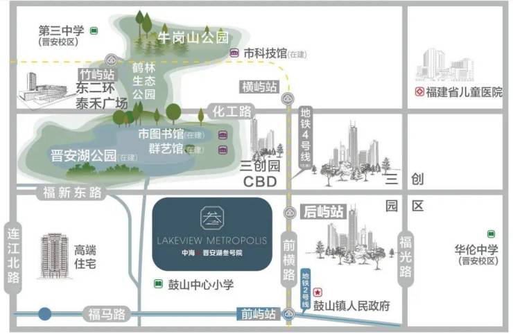 晋安湖核芯+TOD模式:项目位于福州“东扩南进”战略的核心——晋安湖三创园CBD旁,距离地铁4号线后屿站仅70米,实现“出站即归家”的便捷生活。地铁4号线已全线通车,3站直达台江万达、6站至东街口,串联城市核心商圈。千亩生态公园环抱:紧邻晋安湖公园、牛岗山生态公园及鹤林生态公园组成的2000亩城市绿肺,相当于1.5个西湖面积,为业主提供全天候自然休闲空间。