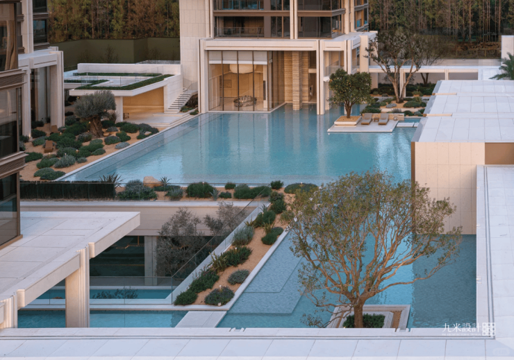 景观以「四境四巷」铺陈东方礼序,「五重归家」轴线串联宽约128米恢弘门庭、约15米叠石飞瀑、约13米榫卯转译的现代穹顶等。约1300㎡下沉式庭院采用三层立体观景设计,15米叠石飞瀑再现《溪山行旅图》的山水意境。