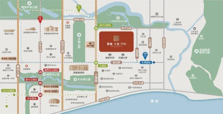 毗邻十五里河生态长廊(在建中),骆岗中央公园(在建中),绿意环绕,自然里的社交场;俯瞰省府中轴公园(规划中)、方兴湖公园、塘西河公园、滨湖国家森林公园、巢湖等自然风景。