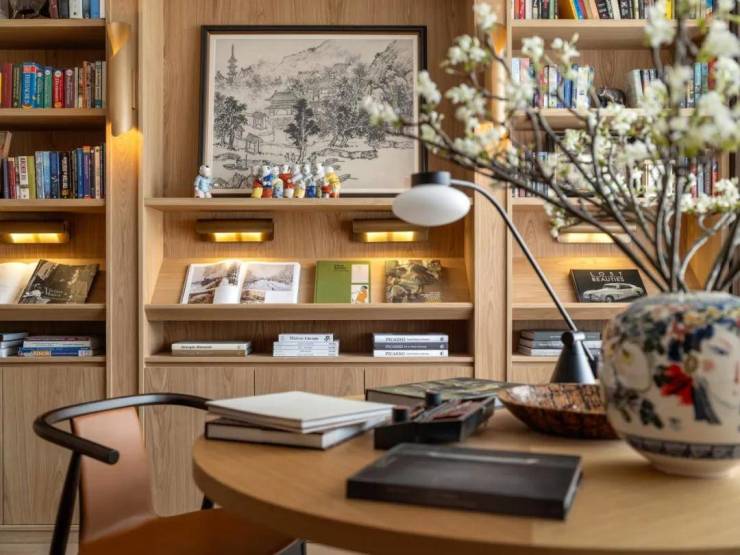 书房色调沉稳大气,精心设计的柔和灯光突显书香气韵,吸引人们长久驻足,于宁静的氛围中品味知识的力量。