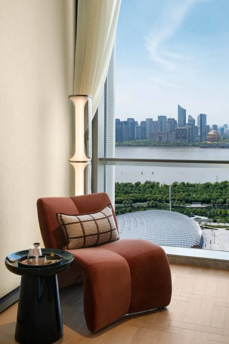 黄昏是它一天中最美的时刻,沐浴在夕阳里,江面映成橘红色的海洋,此时室内外的景观已经没有明确的界限,二者融为一体,这里是“杭州中轴”独有视野。什么叫稀缺资源占有,这就是全杭州不可复制的稀缺资源占有。