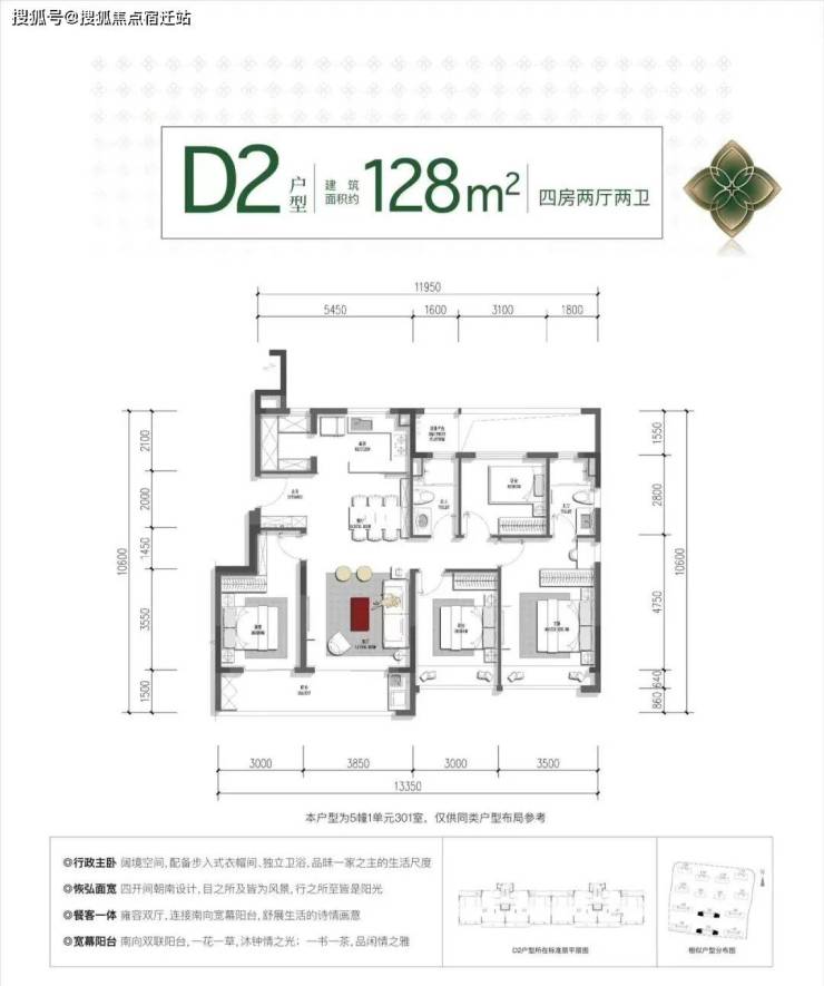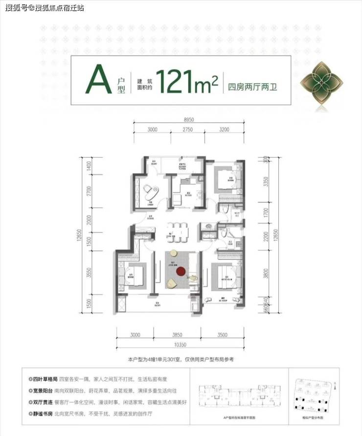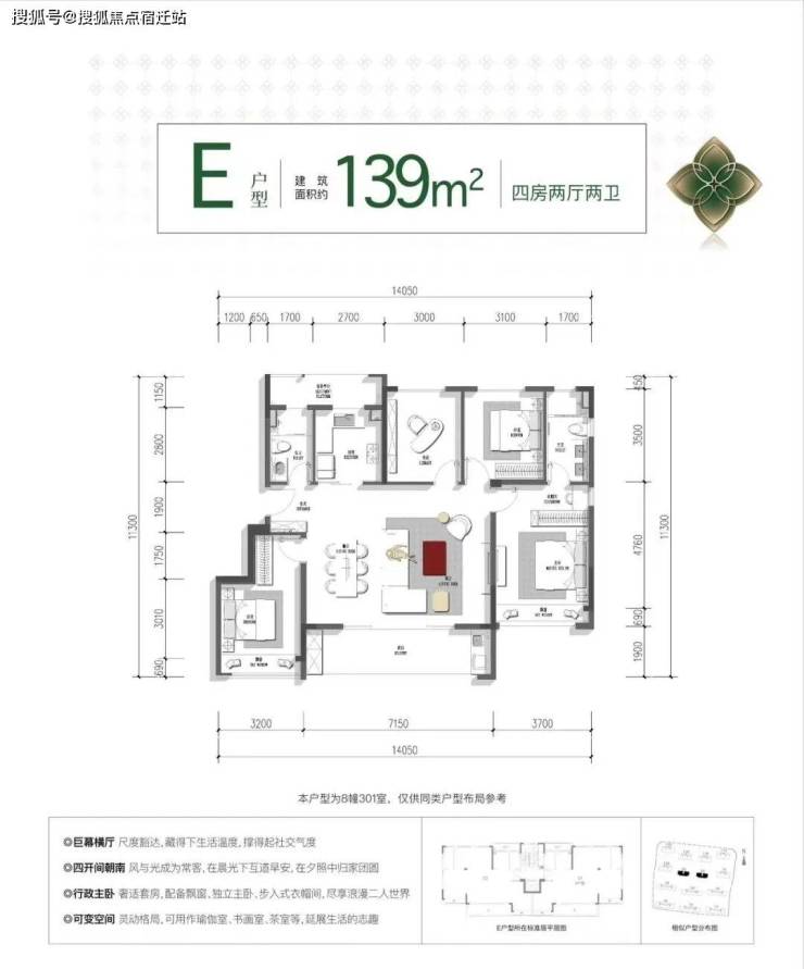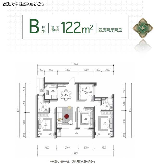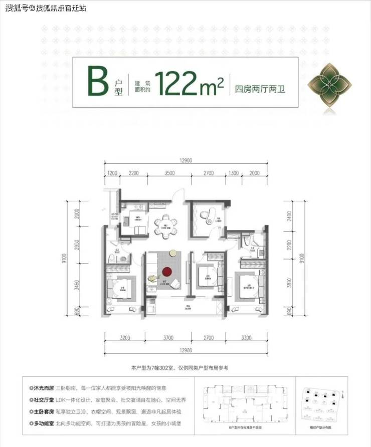 建面约122㎡户型,四开间朝南,市面上少有。宽景阳台+双飘窗的设计,使得南向面宽达近13米。