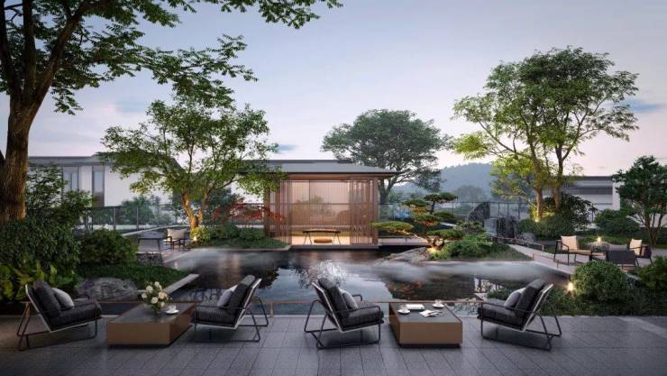 有别于传统中式的冷寂,仙女湖小镇的庭院产品呈现出更为经典的当代感。比如,中式大屋顶抽象为简约轻巧的形态韵味;院墙在保留山地民居情怀的前提下,以石材与玻璃等材质,顺应山势呈现出独特的时代气息;门窗在传统范式基础上,增大了开间尺度,尽可能将阳光与风景迎入室内。