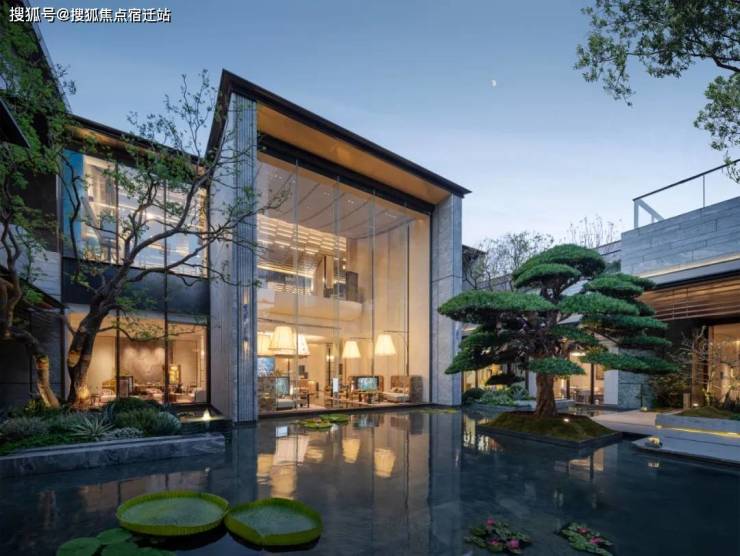 凤起冕旒|东方礼序的当代演绎;主入口门头以古代礼冠“冕旒”为灵感,采用现代设计语汇,构筑约85米“凤起冕旒”华贵门仪。景泰蓝垂幕「旒珠振玉」镶嵌其间,既呼应传统东方礼制,亦致敬苏州的时代封面与源点气质。门庭景观取罗汉松、朴树等珍稀树种,将奢石、水景与自然精巧融合,构筑一方承袭千年盛韵的尊荣之境。