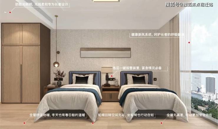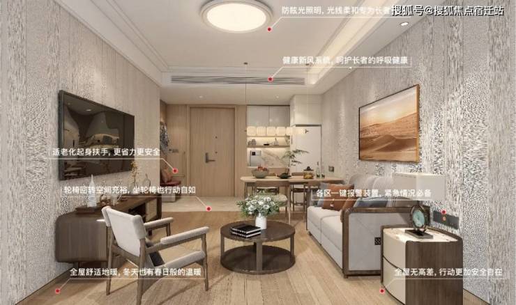 •产权居家养老公寓,医康养融合保障,户型全朝南、大面落地窗设计,恒温恒氧空间,室内紧急报警装置,突发情况紧急救治。